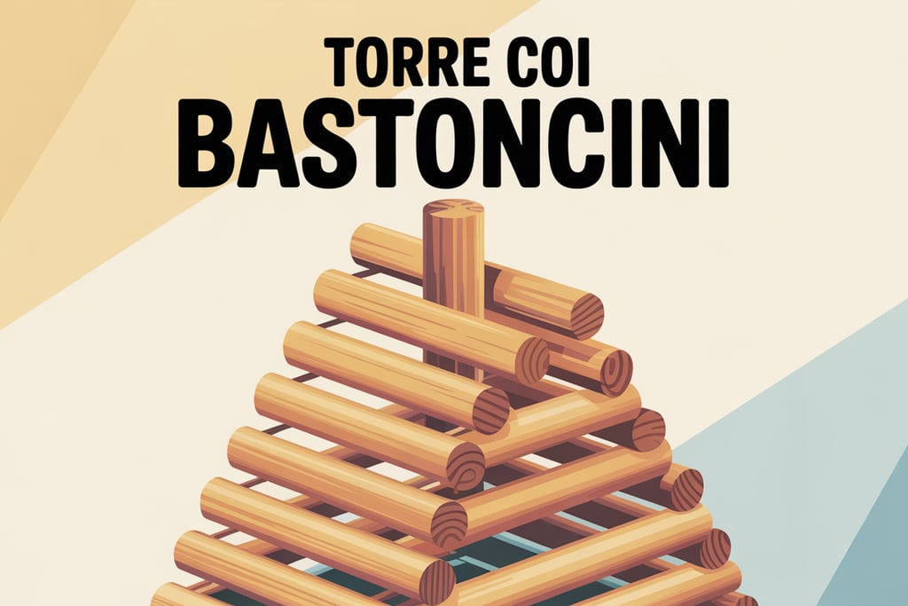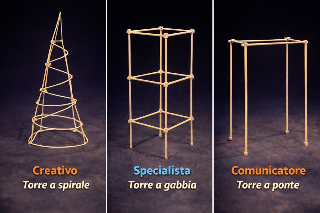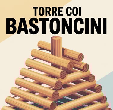 Ogni gruppo costruisce una torre usando solo bastoncini ed nastro, seguendo uno stile diverso (spirale, gabbia o ponte). La torre mostra come lavorate insieme: idee, tecnica e comunicazione fanno la differenza tra stare in piedi o crollare.